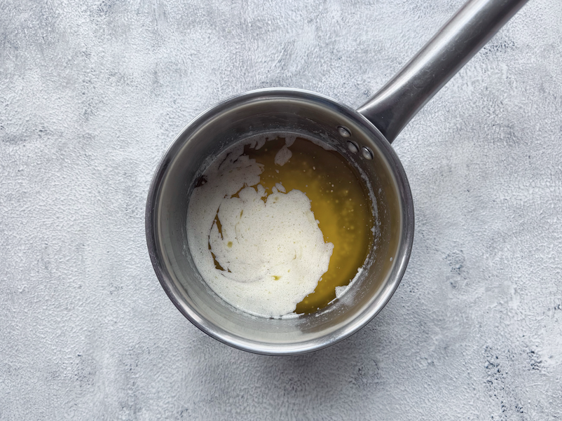 - Smelt de roomboter in een kleine steelpan op laag vuur of in de magnetron. Laat de boter niet bruisen of bruin worden. Zet dan het vuur uit.