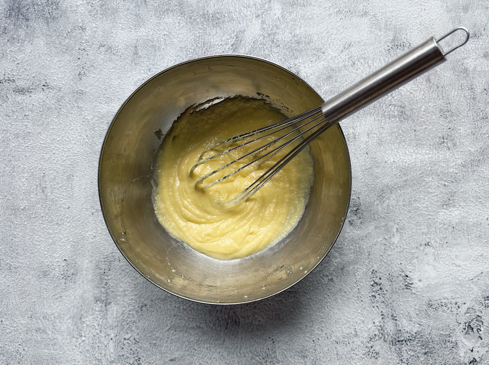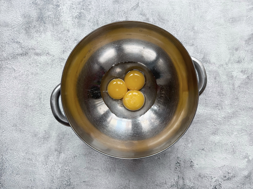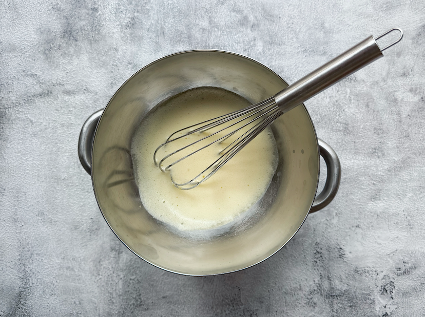 - Doe de eierdooiers met twee eetlepels koud water in een hittebestendige kom en klop dit met een garde door elkaar. Plaats de kom bovenop een pan met daarin heel rustig kokend water. Zorg ervoor dat de bodem van de kom het water niet raakt. Blijf kloppen totdat het mengsel lichter van kleur is en de consistentie van vloeibare slagroom heeft bereikt. Zet dan het vuur uit.