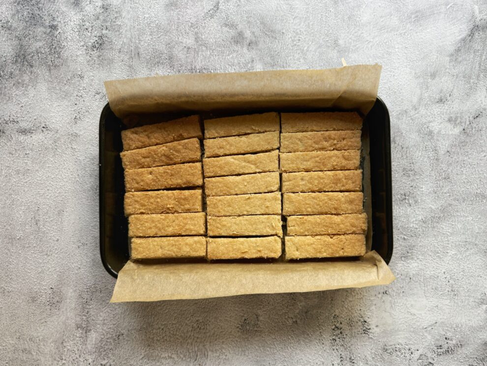 - Snijd het shortbread meteen na het bakken in repen of blokjes terwijl het nog warm is. Laat de koekjes daarna volledig afkoelen.