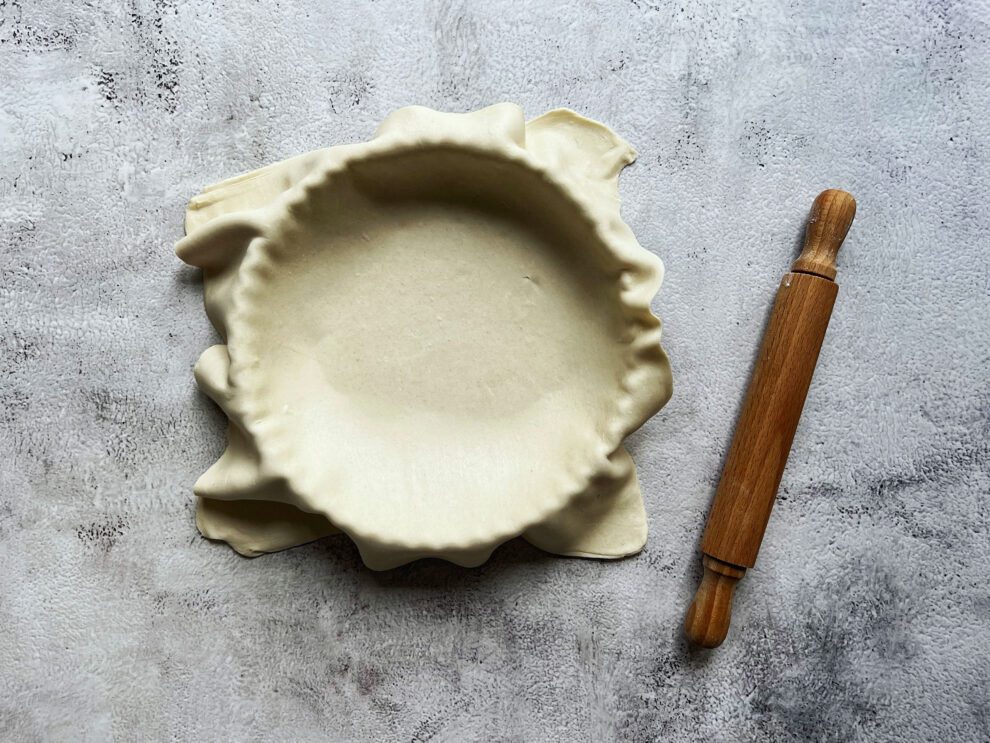 - Voor een rustieke look kun je de plakjes bladerdeeg losjes in de vorm drukken zonder uit te rollen tot één lap.