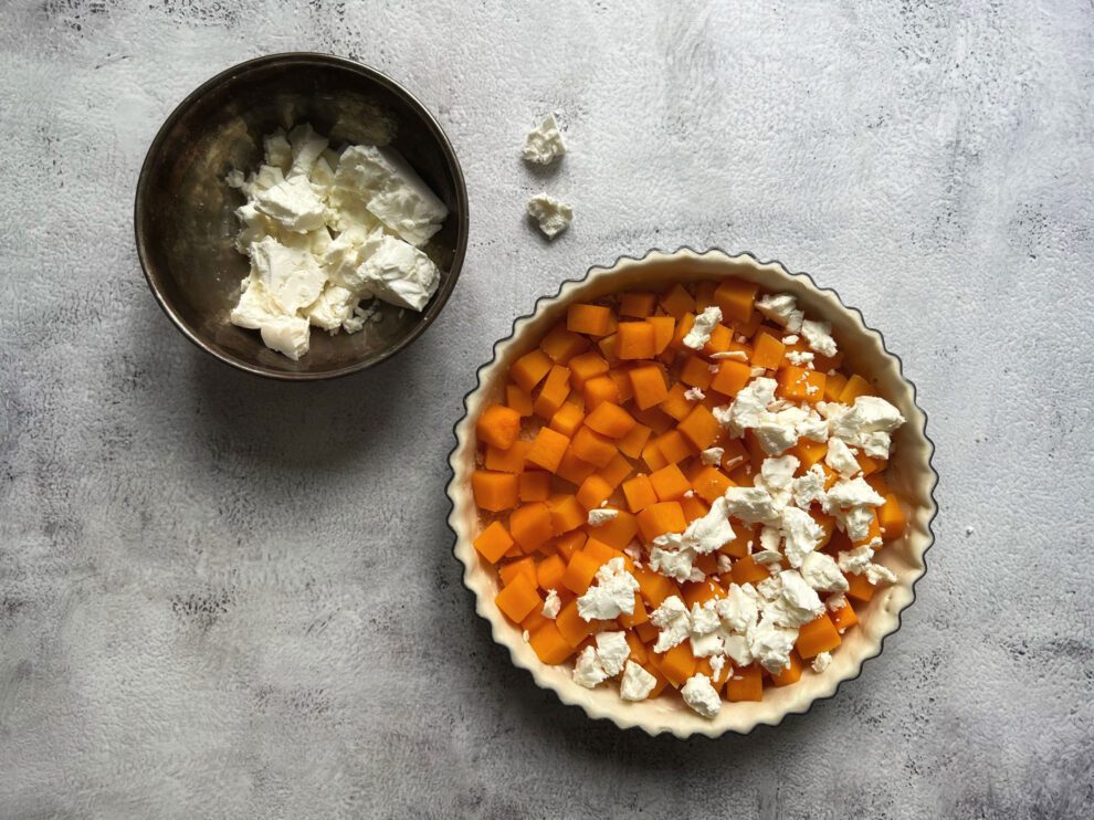 In dit recept gebruiken we pompoen en feta als voorbeeld, maar onderaan vind je allerlei variatietips. Zo kan je elke keer opnieuw een andere quiche op tafel zetten.