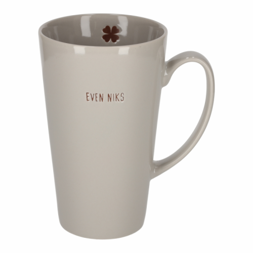 Deze keramische mok met oor heeft een glanzende afwerking en een inhoud van 370 ml. Op de voorkant staat de tekst "Even niks". Aan de binnenzijde is een klein icoon gegraveerd.