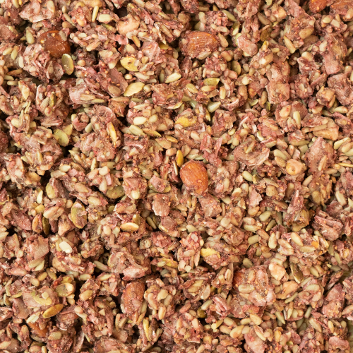 Deze granola is samengesteld uit een smaakvolle mix van noten en pitten, waaronder bruine amandelen, zonnebloempitten en pijnboompitten. De toevoeging van gevriesdroogde frambozen en aardbeien geeft de mix niet alleen een frisse, fruitige smaak, maar ook een mooie, rode kleur.